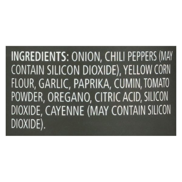 ingredients : onion;chili peppers;may contain silicon dioxide;yellow corn flour;garlic;paprika;cumin;tomato powder;oregano;citric acid;silicon dioxide;cayenne