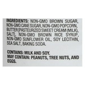 ingredients : brown sugar;cane sugar;popcorn;salted butter (pasteurized sweet cream, salt);brown rice syrup;sunflower oil;sea salt;soy lecithin;baking soda