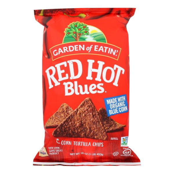Garden of eatin, blue corn tortilla chips red hot party size is an authentic crispy chip with the spicy twist of cayenne pepper, but made as always with organic whole corn kernels and expeller-pressed oils. Although these chips have no genetically modified ingredients, no hydrogenated oils, no artificial flavors, colors or preservatives, they taste great. They are kosher certified, gluten-free and organic. Each bag contains 16 oz. Of delicious chips.