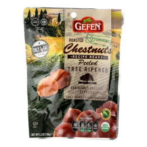 Gefen organic roasted chestnuts come peeled and ready to use in your favorite recipes. These tree-ripened chestnuts make a perfect addition to tarts, truffles, soups and even hummus. Each serving contains just 1 g. Of fat and is a good source of vitamin c, giving you a health-smart cooking component. This 5.2 oz. Bag contains about four servings.
