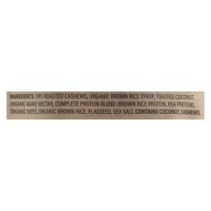 ingredients : dry roasted cashews;organic brown rice syrup;toasted coconut;organic agave nectar;complete protein blend;organic brown rice protein;pea protein;organic dates;organic media brown rice;flaxseed;sea salt
