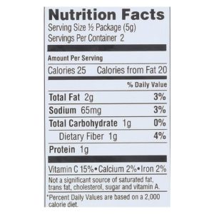 Gimme snacks, roasted seaweed sesame toasted is made with organic roasted seaweed, organic toasted sesame oil, organic sunflower oil and sea salt. Gimme has harvested a high quality seaweed and created a healthy, gluten-free, organic, non-gmo and vegan snack you will love. Each bag of seaweed chips contains a two serving size of 0.35 ounces.