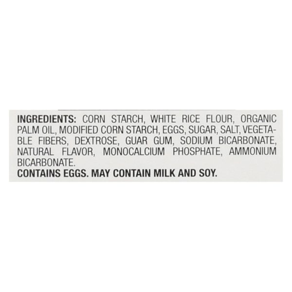 ingredients : corn starch;white rice flour;organic palm oil;modified corn starch;eggs;sugar;salt;vegetable fibers;dextrose;guar gum;sodium bicarbonate;natural flavor;monocalcium phosphate;ammonium bicarbonate