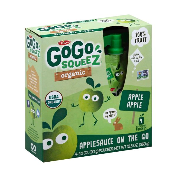 Gogo squeez organic apple apple makes it easier for kids and families to be a little healthier and happier every day with applesauce on the go. These squeeze pouches are easy for kids to eat and require no dish washing. This delicious applesauce is gluten-free, kosher, non-gmo and does not contain artificial ingredients. Each box of gogo squeez organic apple apple contains four 3.2 oz. Pouches of applesauce.