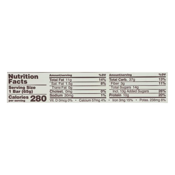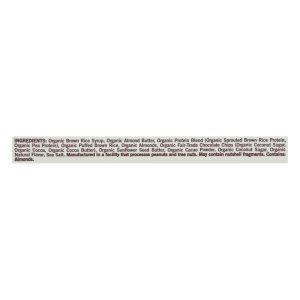ingredients : organic brown rice syrup;organic almond butter;organic protein blend (organic sprouted brown rice protein, organic pea protein);organic almonds;organic puffed brown rice;organic chocolate chips (organic coconut sugar, organic cocoa, organic cocoa butter);organic sunflower seed butter;organic cocoa powder;organic coconut sugar;organic natural flavor;sea salt