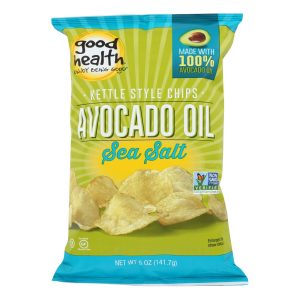 Good health avocado oil sea salt kettle chips have less fat than regular potato chips. With 100% avocado oil, these chips are a savory alternative for snacking. These chips are also gluten-free, kosher, non-gmo and have low sodium. Each bag of good health avocado oil sea salt kettle chips contains 5 oz. Of product.
