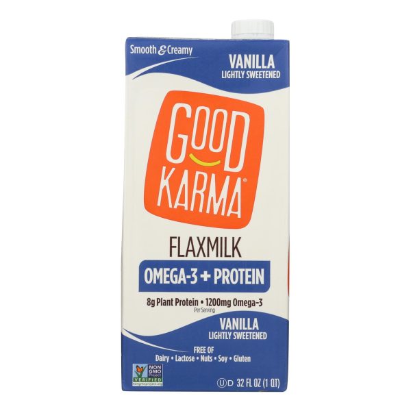 Smooth & creamy. Omega-3 + protein. Per serving: 8 g plant protein; 1200 mg omega-3. Free of: dairy; lactose; nuts; soy; gluten. Non gmo project verified. Nongmoproject.org. Smile! this flaxmilk is processed for longer shelf life and can be stored unrefrigerated. Good karma employs strict allergen control processes. For more information, visit us at: goodkarmafoods.com/allergens. Goodkarmafoods.com. Please recycle. Recyclecartons.com. Rich, creamy, delicious, happy! the smooth and satisfying flavor of good karma flax milk + protein inspires a full heart and good health! made with cold-pressed flaxseed oil and 8 grams of plant-based protein, it’s a delicious and nutritious addition to your day. Plus, good karma flaxmilk + protein is versatile, creamy, and, as always, free of major allergens. That’s enough to make anyone smile! excellent source of calcium and vitamin d. 20% less sugar than dairy milk (1 cup of lowfat dairy milk contains 12 g sugar vs 1 cup of good karma vanilla lightly sweetened contains 10 g sugar. Usda national nutrient database for standard reference release 28. Data consistent with typical lowfat dairy milk). Kosher, vegan and non-gmo. Zero cholesterol. No: dairy, lactose, nuts, soy, gluten. Tetra pak: protects what’s good. A little good karma goes a long way. Good karma isn’t just our name, it’s the inspiration for everything we do. Just as great nutrition can start with a small yet powerful flax seed, we believe we can create a better world with the tiny but mighty choices we make every day. From nourishing our bodies, to helping someone in need, to positively impacting the communities around us, the rippling effect of good karma enhances all of our lives. We would love to hear and share your stories of good karma. Please visit us at: facebook; twitter; instagram. Goodkarmafoods.com. Product of usa.