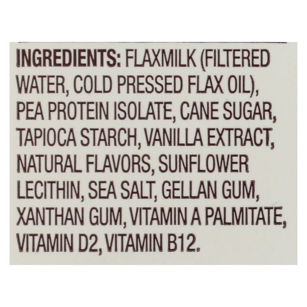 ingredients : flaxmilk (filtered water, cold pressed flax oil);pea protein isolate;cane sugar;tapioca starch;vanilla extract;natural flavors;sunflower lecithin;sea salt;gellan gum;xanthan gum;vitamin a palmitate;vitamin d2;vitamin b12