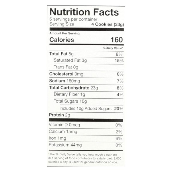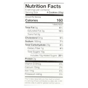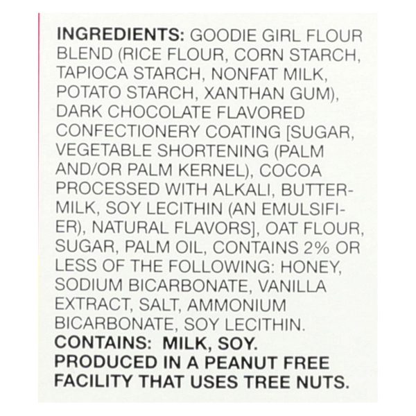 ingredients : goodie girl flour blend;rice flour;corn starch;tapioca starch;nonfat milk;potato starch;xanthan gum;dark chocolate flavored confectionery coating [sugar;vegetable shortening;palm and/or palm kernel;cocoa processed with alkali;butter-milk;soy lecithin;an emulsifier;natural flavors];oat flour;sugar;palm oil;contains 2% or less of the following: honey;sodium bicarbonate;vanilla extract;salt;ammonium bicarbonate;soy lecithin. Contains: milk;soy