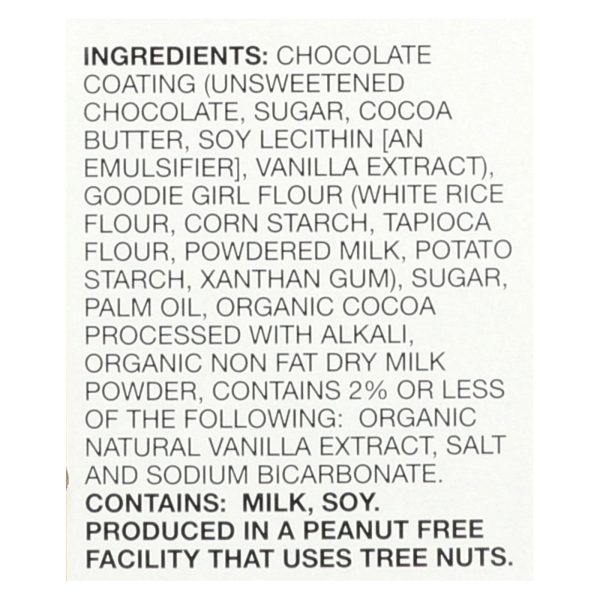 ingredients : chocolate coating;unsweetened chocolate;sugar;cocoa butter;soy lecithin [an emulsifier];vanilla extract;goodie girl flour;white rice flour;corn starch;tapioca flour;powdered milk;potato starch;xanthan gum;palm oil;organic cocoa processed with alkali organic non fat dry ilk powder;contains 2% or less natural vanilla extract;salt and sodium bicarbonate