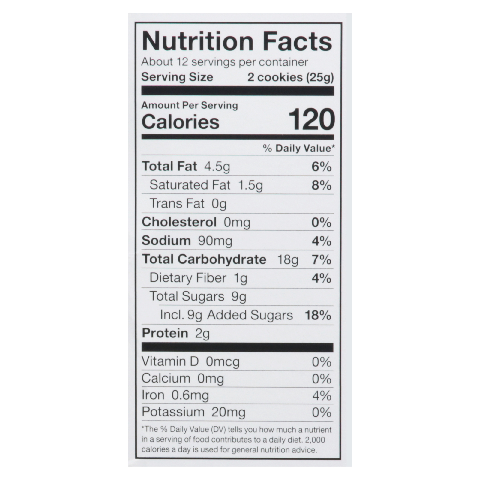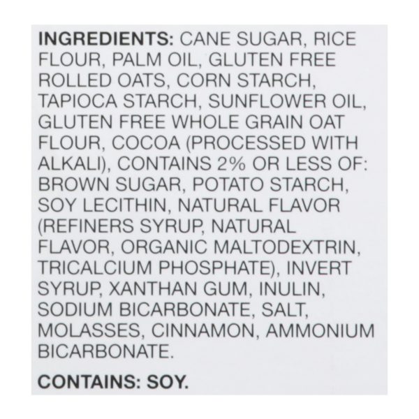 ingredients : cane sugar;gluten free whole grain oat flour;rice flour;palm oil;high oleic sunflower oil (or canola oil);tapioca starch;invert sugar;contains less than 2% of each of the following: cocoa (processed with alkali), soy lecithin, corn starch, inulin, baking soda, xanthan gum, salt, cinnamon, natural flavors, organic maltodextrin, tricalcium phosphate, ammonium bicarbonate