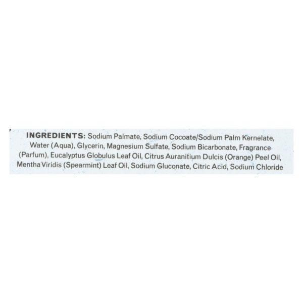 ingredients : sodium palmate;sodium cocoate/sodium palm kernelate;water;aqua;glycerin;magnesium sulfate;sodium bicarbonate;fragrance;parfum;eucalyptus globulus leaf oil;citrus aurantium dulcis;orange;peel oil;mentha viridis;spearmint;leaf oil;sodium gluconate;citric acid;sodium chloride