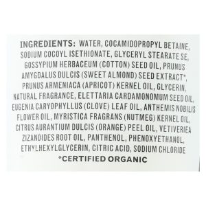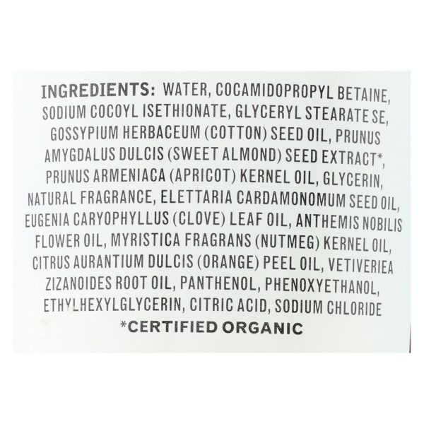ingredients : water (aqua);cocamidopropyl betaine;sodium cocoyl isethionate;glyceryl stearate se;gossypium herbaceum (cotton) seed oil;prunus amygdalus dulcis (sweet almond) oil;prunus armeniaca (apricot) kernel oil;natural fragrance (parfum);elettaria cardamomum seed oil;eugenia caryophyllus (clove) leaf oil;anthemis nobilis flower oil;myristica fragrans (nutmeg) kernel oil;citrus aurantium dulcis (orange) peel oil;vetiveriea zizanoides root oil;panthenol;glycerin;citric acid;sodium chloride;benzyl alcohol;b