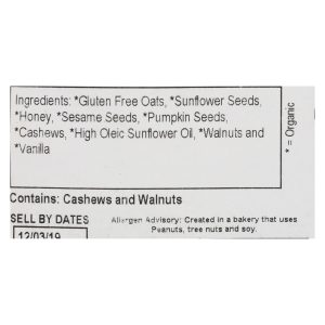 ingredients : gluten free oats;sunflower seeds;honey;sesame seeds;pumpkin seeds;cashews;high oleic sunflower oil;walnuts and *vanilla