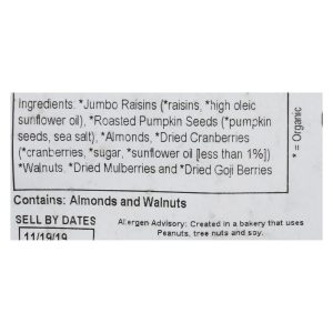 ingredients : jumbo raisins;raisins;high oleic sunflower oil;roasted pumpkin seeds;pumpkin seeds;sea salt;almonds;dried cranberries;cranberries;sugar;sunflower oil [less than 1%];walnuts;dried mulberries and *dried goji berries