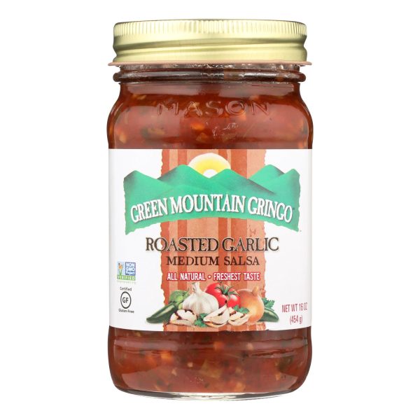 Green mountain gringo salsa, roasted garlic is an all natural medium salsa. It is certified gluten-free, kosher-parve by u.s. Kosher supervision, ava-vegetarian and non-gmo. This salsa contains no preservatives and is 100% fat-free. Each jar contains 16 oz. Of roasted garlic salsa. See nutrition facts panel for allergen information.