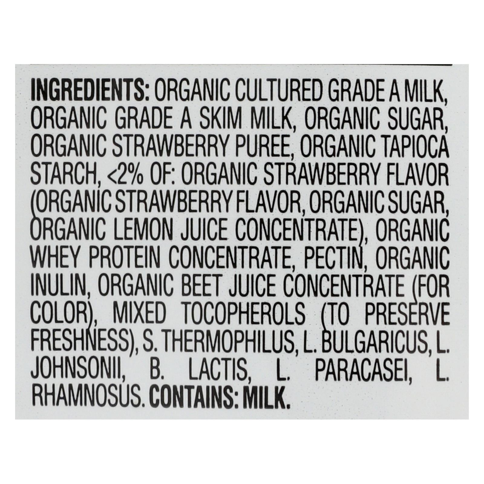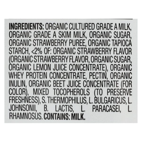 ingredients : organic cultured grade a milk;organic grade a skim milk;organic sugar;organic strawberry puree;organic tapioca starch;<2% of: organic strawberry flavor;organic strawberry flavor;organic lemon juice concentrate;organic whey protein concentrate;pectin;organic inulin;organic beet juice concentrate;for color;mixed tocopherols;to preserve freshness;s. Thermophilus;l. Bulgaricus;l. Johnsonii;b. Lactis;l. Paracasei;l. Rhamnosus