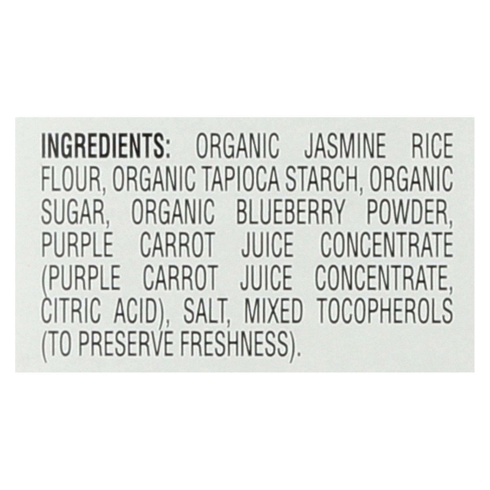 ingredients : organic jasmine rice flour;organic tapioca starch;organic sugar;organic blueberry powder;purple carrot juice concentrate;citric acid;salt;mixed tocopherols;to preserve freshness