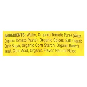 ingredients : water;organic tomato puree;organic tomato paste;organic spices;salt;organic cane sugar;organic corn starch;organic baker’s yeast;citric acid;organic flavor;natural flavor
