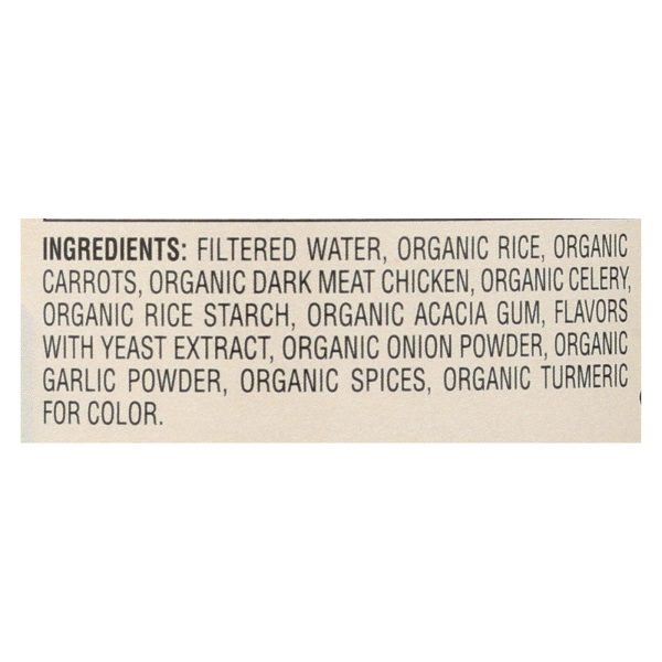 ingredients : filtered water;orange rice;organic carrots;organic dark meat chicken;contains 2% or less of each of the following: organic celery, organic rice starch, organic acacia gum, natural flavors, yeast extract, organic onion powder, organic garlic powder, organic spices with organic celery, organic turmeric (color)