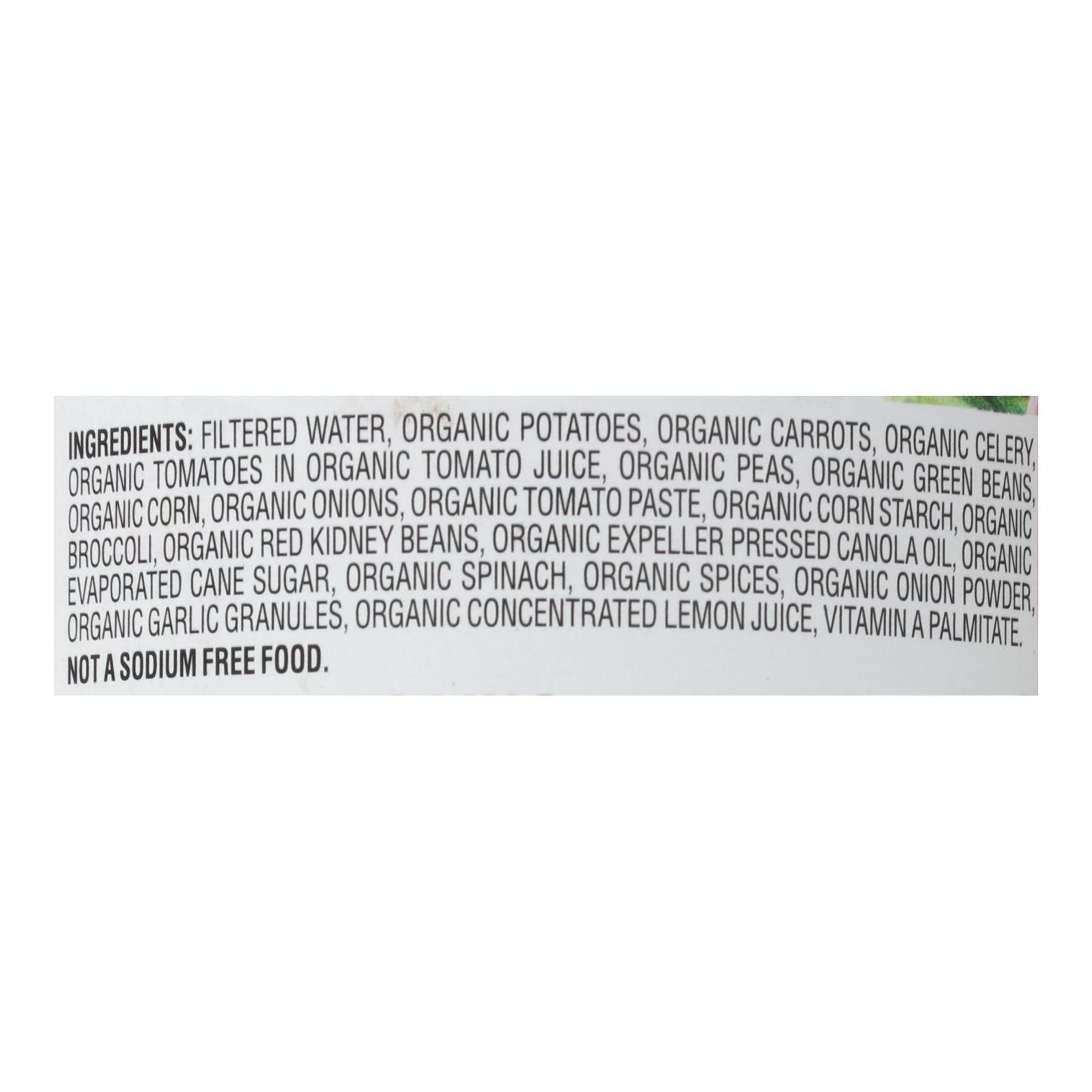ingredients : water;organic potatoes;organic carrots;organic celery;organic diced tomatoes;organic corn;organic peas;organic green beans;organic onions;organic tomato paste;organic corn starch;organic red kidney beans;organic canola oil;organic cane sugar;organic spinach;organic spices;organic onion powder;organic garlic granules;organic concentrated lemon juice;vitamin a palmitate