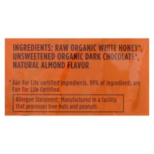 Heavenly organics candy, chocolate honey almond patties, has only three ingredients: 100% dark chocolate, raw white honey and natural almond flavor. Our chocolate honey patties have a dark chocolate shell made from 100% cocoa that is filled with 100% organic raw white honey blended with almond flavoring. These decadent, bite-sized treats not only taste amazing, but dark chocolate and raw honey both offer minerals and immunity-boosting antioxidants. With just three ingredients and only 50 calories each, you can indulge without guilt. This candy comes in a 12 piece bag,