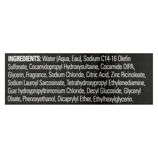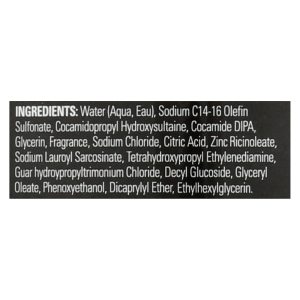 ingredients : water;aqua;eau;sodium c14-16 olefin sulfonate;cocamidopropyl hydroxysultaine;cocamide dipa;glycerin;fragrance;sodium chloride;citric acid;zinc ricinoleate sodium lauroyl sarcosinate;tetrahydroxypropyl ethylenediamine;guar hydroypropyltrimonium chloride;decyl glucoside;glyceryl oleate;phenoxyethanol;dicaprylyl ether;ethylhexylglycerin