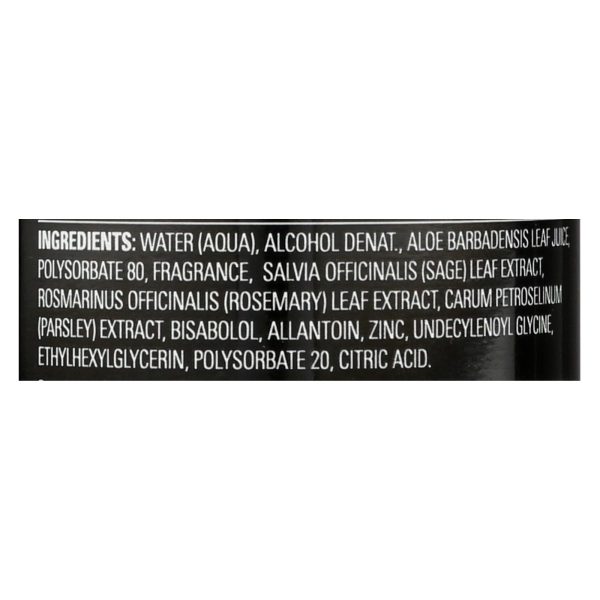 ingredients : water;aqua;alcohol denat;aloe barbadensis leaf juice;polysorbate 80;fragrance;salvia officinalis;sage;leaf extract;rosmarinus officinalis;rosemary;carum petroselinum;parsley;extract;bisabolol;allantoin zinc;undecylenoyl;glycine;ethylhexylglycerin;polysorbate 20;citric acid