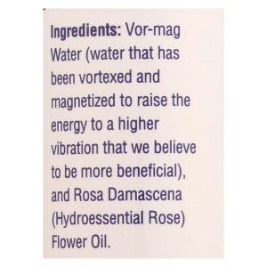 ingredients : vor-mag water;water that has been vortexed and magnetized to raise the energy to a higher vibration that we believe to be more beneficial;and rosa damascena;hydroessential rose;flower oil