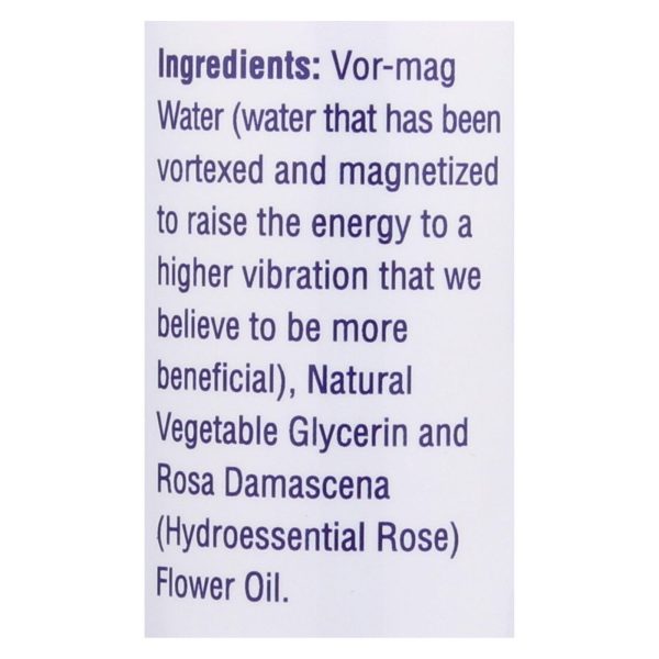 ingredients : vor-mag water;water that has been vortexed and magnetized to raise the energy to a higher vibration that we believe to be more beneficial;natural vegetable glycerin and rosa damascena;hydroessential rose;flower oil