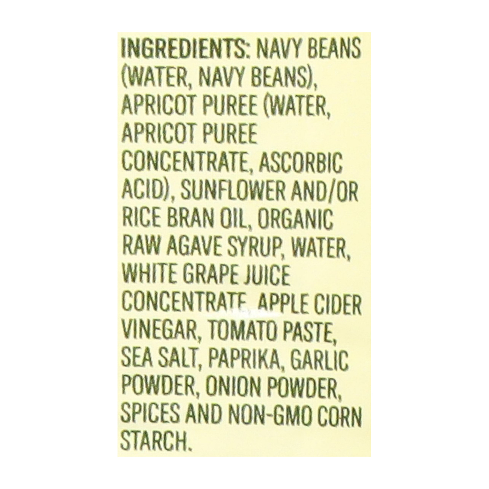 ingredients : navy beans (water, navy beans);apricot puree (water, apricot puree concentrate, ascorbic acid);sunflower and/or rice bran oil;organic raw agave syrup;water;white grape juice concentrate;apple cider vinegar;tomato paste;sea salt;paprika;garlic powder;onion powder;spices and non-gmo corn starch