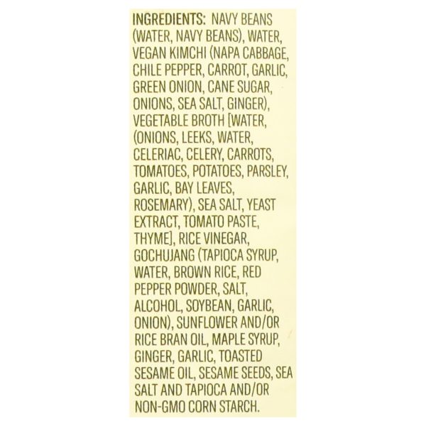 ingredients : navy beans (water, navy beans);water;vegan kimchi (napa cabbage, chile pepper, carrot, garlic, green onion, cane sugar, onions, sea salt, ginger);vegetable broth [water, (onions, leeks, water, celeriac, celery, carrots, tomatoes, potatoes, parsley, garlic, bay leaves, rosemary), sea salt, yeast extract, tomato paste, thyme];rice vinegar;gochujang (tapioca syrup, water, brown rice, red pepper powder, salt, alcohol, soybean, garlic, onion);sunflower and/or rice bran oil;maple syrup;ginger;garlic;t
