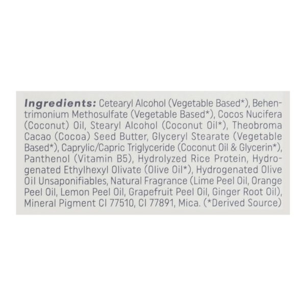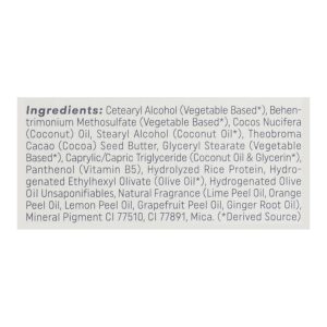 ingredients : cetearyl alcohol (vegetable based*);behentrimonium methosulfate (vegetable based*);cocos nucifera (coconut) oil;stearyl alcohol (coconut oil*);theobroma cacao (cocoa) seed butter;glyceryl stearate (vegetable based*);caprylic/capric triglyceride (coconut oil & glycerin*);panthenol (vitamin b5);hydrolyzed rice protein;hydrogenated ethylhexyl olivate (olive oil*);hydrogenated olive oil unsaponifiables;natural fragrance (lime peel oil, orange peel oil, lemon peel oil, grapefruit peel oil, ginger