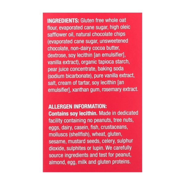 ingredients : gluten free whole oat flour;evaporated cane sugar;high oleic safflower oil;natural chocolate chips;unsweetened chocolate;non-dairy cocoa butter;dextrose;soy lecithin [an emulsifier];vanilla extract;organic tapioca starch;pear juice concentrate;baking soda;sodium bicarbonate;pure vanilla extract;salt;cream of tartar;xanthan gum;rosemary extract