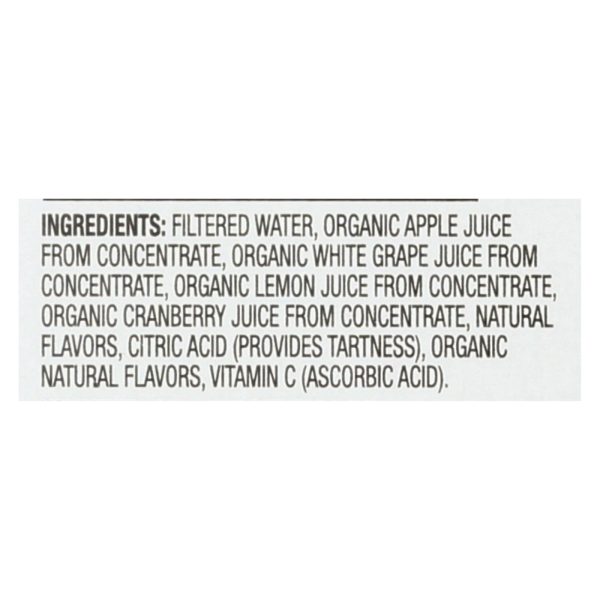 ingredients : filtered water;organic apple juice from concentrate;organic white grape juice from concentrate;organic lemon juice from concentrate;organic cranberry juice from concentrate;natural flavors;citric acid;provides tartness;organic natural flavors;vitamin c;ascorbic acid
