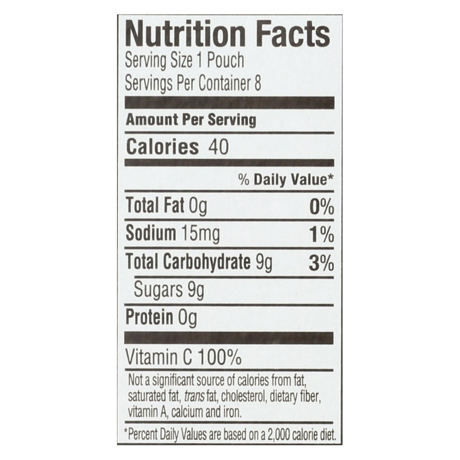 Honest kids berry berry good lemonade kids beverage is sweetened with only fruit juice which means that it has less sugar than the leading kids juice drinks. With only 9 g. Of sugar per pouch, this is a drink you can feel good about giving to your kids. This delicious drink provides kids with 100% of their daily vitamin c and it is also organic, gluten-free and non-gmo. Each box of honest kids berry berry good lemonade kids beverage contains eight 6.75 fl. Oz. Pouches.