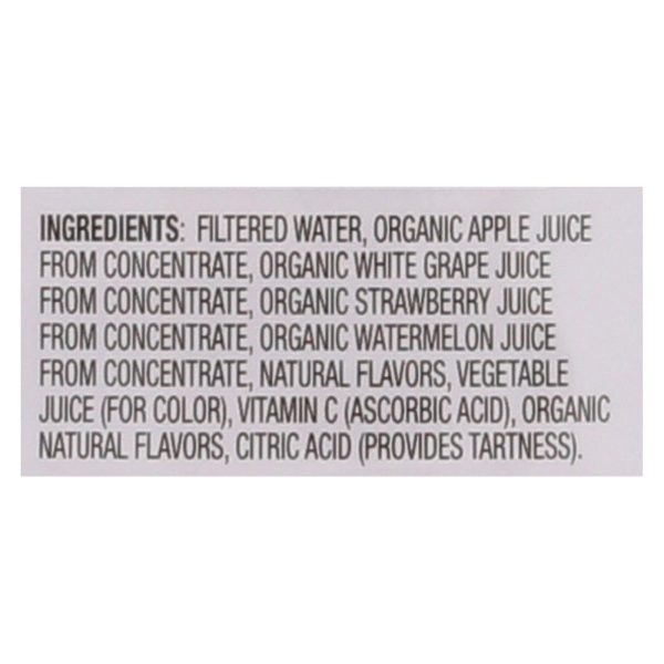 ingredients : filtered water;organic apple juice from concentrate;organic white grape juice from concentrate;organic strawberry juice from concentrate;organic watermelon juice from concentrate;natural flavors;vegetable juice;for color;vitamin c;ascorbic acid;organic natural flavors;citric acid;provides tartness