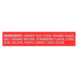 ingredients : organic rice flour;organic sugar;salt;organic natural strawberry flavor;citric acid;gelatin;purple carrot juice color