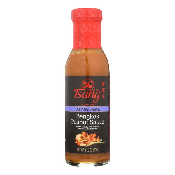 House of tsang bangkok peanut dipping sauce is gluten-free. It features peanut butter, soy sauce, rice vinegar and sesame seed oil along with sherry wine and lemongrass and ginger purees. Every 11.5 oz. Bottle of house of tsang bangkok peanut dipping sauce contains 0 g. Of saturated fat, 0 g. Of trans fat and 0 mg. Of cholesterol.