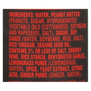ingredients : water;peanut butter;peanuts;sugar;hydrogenated vegetable oils [cottonseed;soybean and rapeseed];salt;soy sauce;soybeans;rice;rice vinegar;sesame seed oil;contains 2% or less of salt;sherry wine;rice starch;dehydrated garlic;lemongrass purée;lemongrass;spice;yeast extract;citric acid;ginger purée;ginger