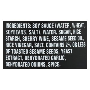 ingredients : soy sauce;water;wheat;soybean;salt;sugar;rice starch;sherry wine;sesame seed oil;rice vinegar;contains 2% or less of toasted sesame seeds;yeast extract;dehydrated garlic;dehydrated onions;spice