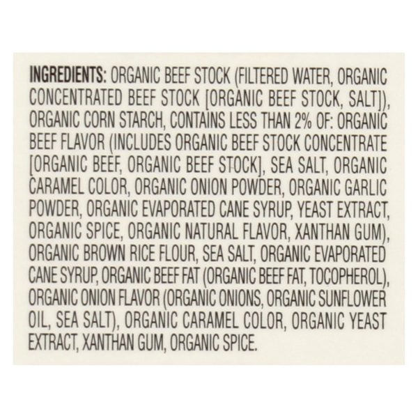 ingredients : organic beef;stock;filtered water;organic concentrated beef stock [organic beef stock;salt];organic corn starch;contains less than 2% of: organic beef flavor;includes organic beef stock concentrate [organic beef;organic beef stock];sea salt;organic caramel color;organic onion powder;organic garlic powder;organic evaporated cane sugar;yeast extract;organic spice;organic natural flavor;xanthan gum;organic brown rice flour;organic beef fat;tocopherol;organic onion flavor;organic onions;organic sunf