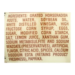 ingredients : grated horseradish roots;water;soybean oil;white distilled vinegar;high fructose corn syrup;eggs;sugar;modified corn starch;salt;lemon juice;xanthan gum;sodium metabisulfite and sodium benzoate;preservatives;artificial flavor;citric acid;spices;calcium disodium edta;retains product freshness;paprika