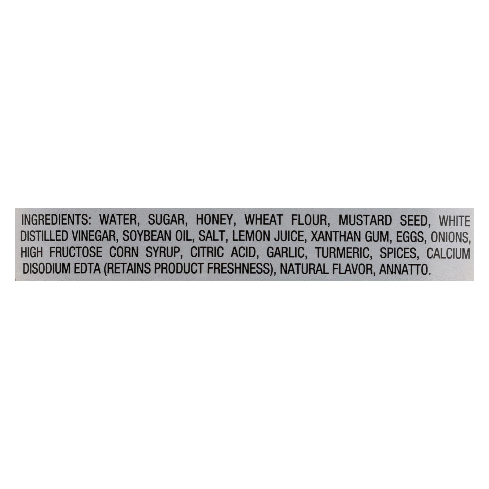 ingredients : water;sugar;honey;wheat flour;mustard seed;white distilled vinegar;soybean oil;salt;lemon juice;xanthan gum;eggs;onions;high fructose corn syrup;citric acid;garlic;turmeric;spices;calcium disodium edta;retains product freshness;natural flavor;annatto