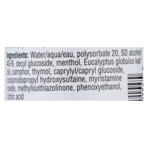 ingredients : water/aqua/eau;polysorbate 20;sd alcohol 40-b;decyl glucoside;menthol;eucalyptus globulus leaf oil;camphor;thymol;caprylyl/capryl glucoside;cocamidopropyl hydroxysultaine;myristamine oxide;methylisothiazolinone;phenoxyethanol;citric acid