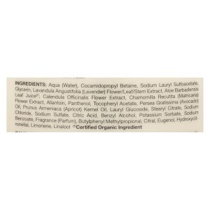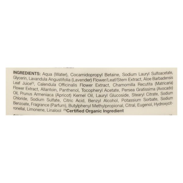 ingredients : aqua;water;cocamidopropyl betaine;sodium lauryl sulfoacetate;glycerin;lavandula angustifolia;lavender;flower/leaf/stem extract;aloe barbadensis leaf juice¹;calendula officinalis flower extract;chamomilla recutita;matricaria;flower extract;allantoin;panthenol;tocopheryl acetate;persea gratissima;avocado;oil;prunus armeniaca;apricot;kernel oil;lauryl glucoside;stearyl citrate;sodium chloride;sodium sulfate;citric acid;benzyl alcohol;potassium sorbate;sodium benzoate;fragrance;parfum;butylphenyl me