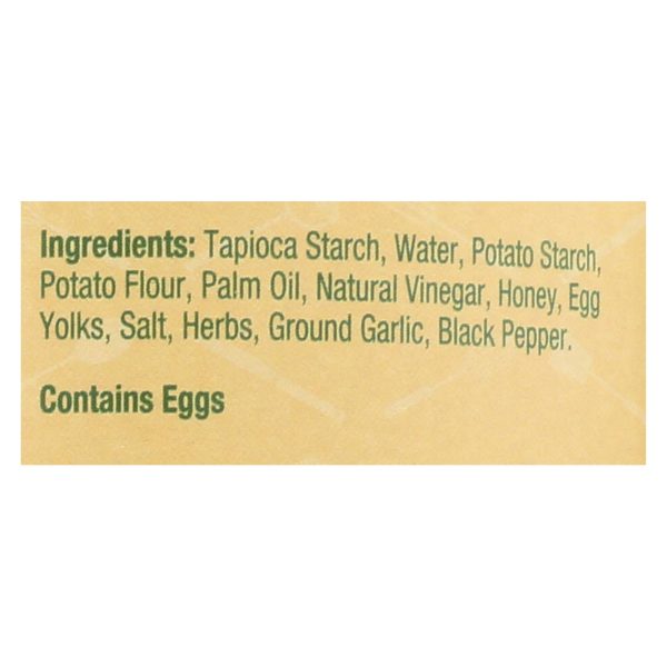 ingredients : tapioca starch;water;potato starch;potato flour;palm oil;natural vinegar;honey;egg yolks;salt;herbs;ground garlic;black pepper