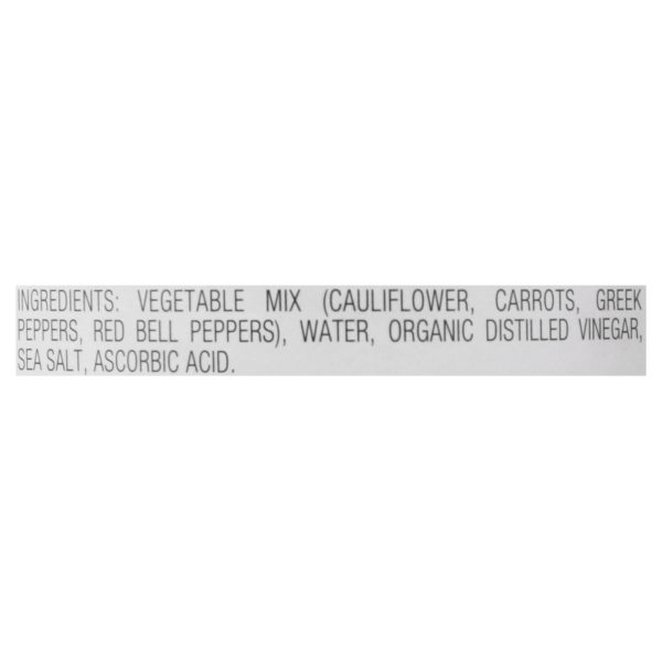 ingredients : vegetable mix;cauliflower;carrots;greek peppers;red bell peppers;water;organic distilled vinegar;sea salt;ascorbic acid