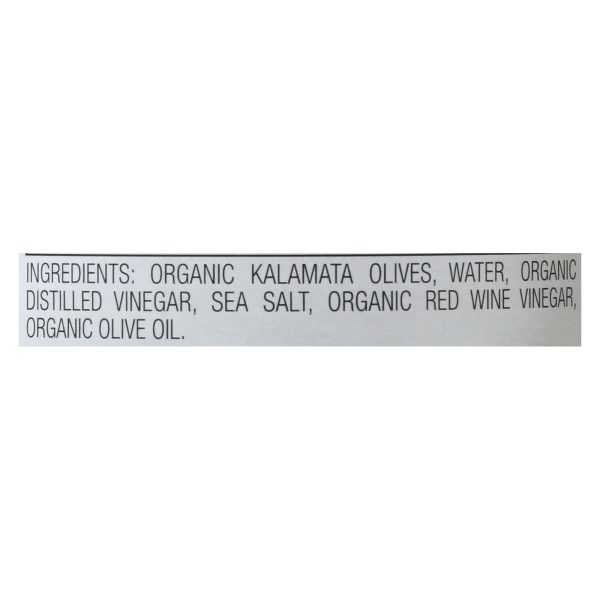 ingredients : organic kalamata olives;water;organic distilled vinegar;sea salt;organic red wine vinegar;organic olive oil