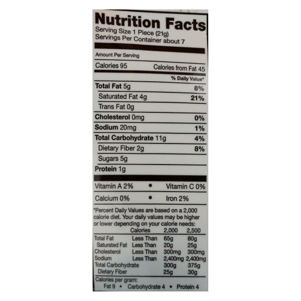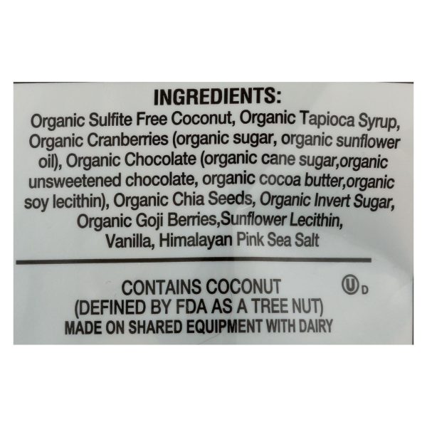 ingredients : organic sulfite free coconut;organic tapioca syrup;organic cranberries (organic sugar, organic sunflower oil);organic semi-sweet chocolate (organic cane sugar, organic unsweetened chocolate, organic cocoa butter, organic soy lecithin an emulsifier);organic invert sugar;organic chia seeds;organic goji powder;organic sunflower lecithin;natural vanilla flavoring;himalayan pink sea salt